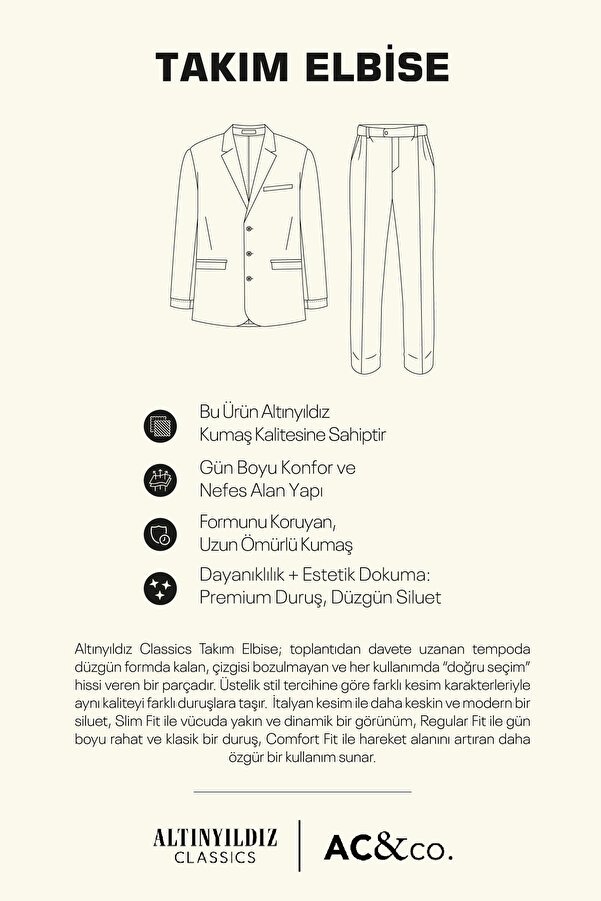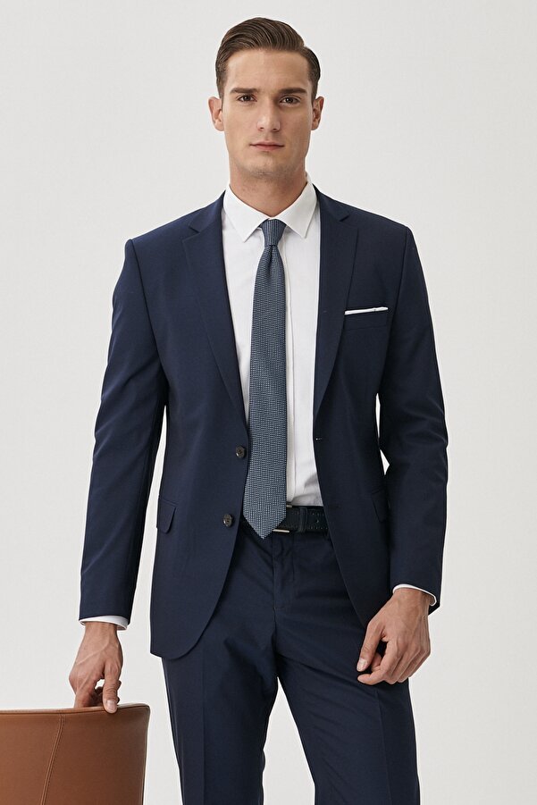 • A breathable, flexible fabric suit is the ideal choice for men who want to achieve both a stylish and comfortable look. This combination adds a modern touch to a classic suit, ensuring you stand out in any setting. What Pieces to Combine It With? Sneakers: White sneakers add a sporty feel to the suit, while colorful sneakers create a more eye-catching look. T-shirt: A basic V-neck or polo shirt creates a stylish contrast under the suit. Shirt: You can use it to achieve a classic look and add elegance to your style. The Suit Provides a Flawless Look in Every Season. Suitable for all four seasons. You can bring your purchased Altınyıldız Classics suits to our stores and benefit from free alterations to the leg length and waist. The slim-fit, mono-collar, fully lined suit, with its viscose blend fabric, ensures your comfort. The flap pocket design completes the look. With its trendy design and stylish appearance, it's poised to become an indispensable piece for your office and special occasions. 70% Polyester, 28% Viscose, 2% Elastane, Plain Navy Blue, Casual Model, Slim Fit, Mono Collar, Long Sleeves, Regular Waist, Narrow Leg, Flap Pockets, Fully Lined, Single Vent, Seasonless, Altınyıldız Classics Slim Fit Narrow Cut Mono Collar Striped Suit, Product Size: 50-6 Drop, Model Information: Height: 1.89cm, Weight: 80kg, Product Code: 4A3023100071LAC. Washing Instructions: Do not tumble dry. Gentle dry cleaning is possible. Do not use bleach. Dry flat. Do not wring. Iron at low temperature. Do not wring in centrifuge machine.
