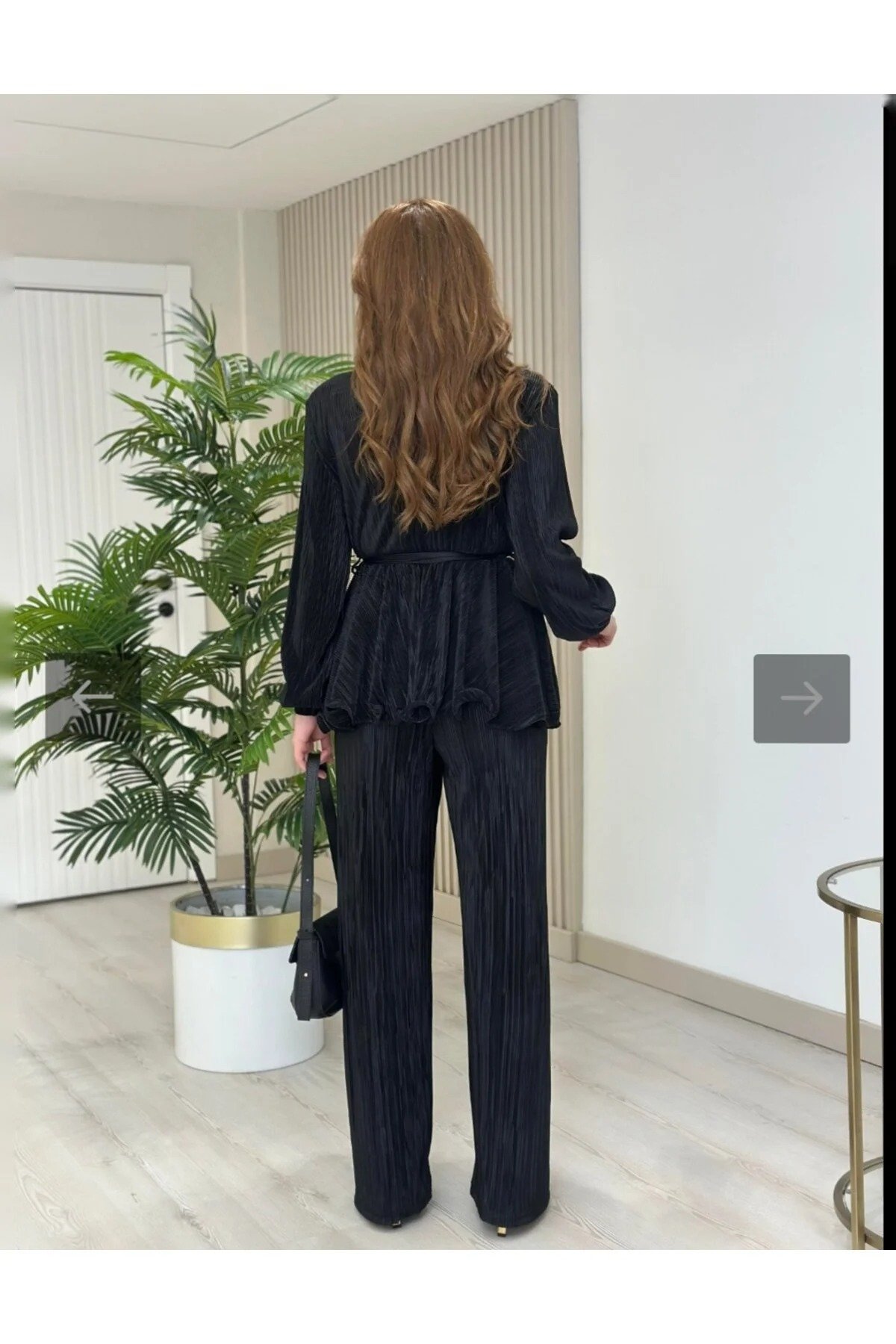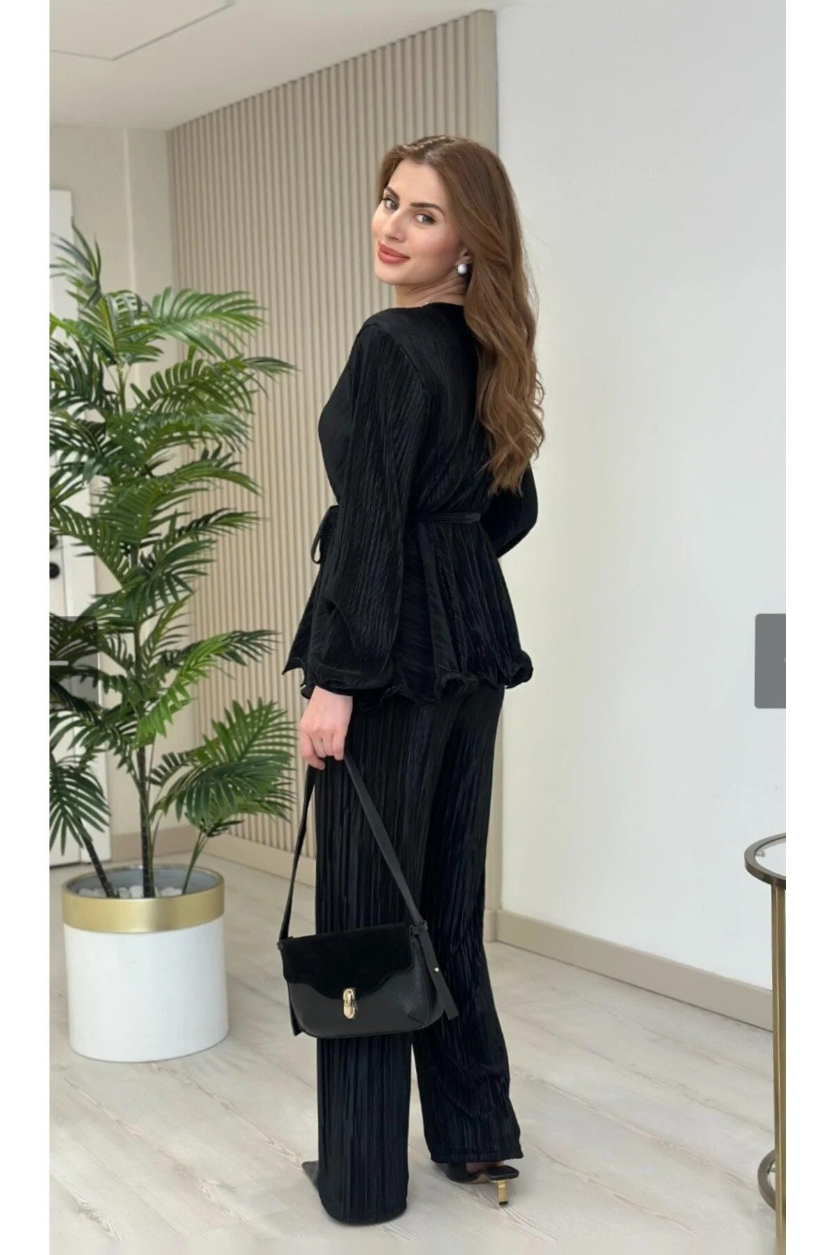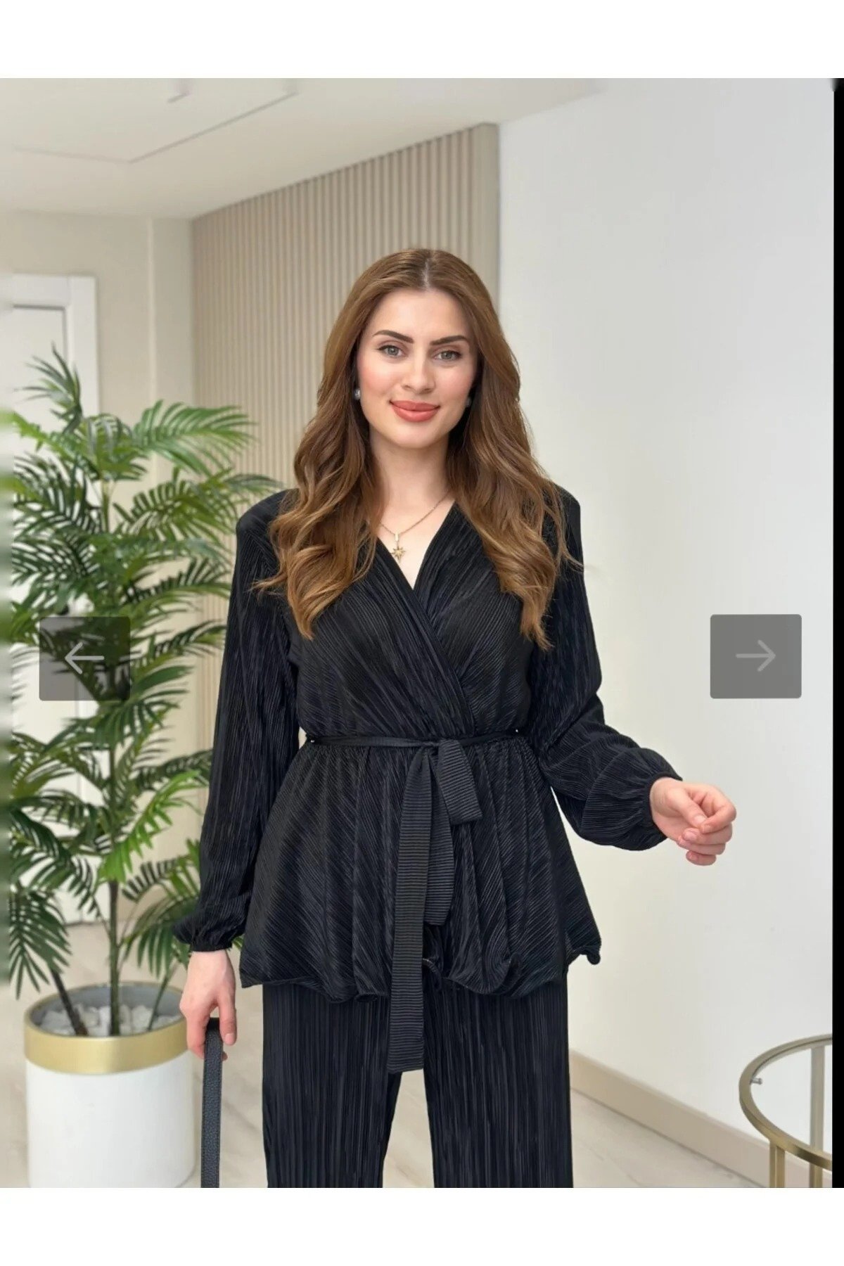 • - Offers comfortable wear with a normal waist height. - Balloon sleeve design gives a modern and stylish look. - Polyester blend fabric provides both durability and comfort. - Wide leg cut doesn't restrict your freedom of movement. - This two-piece set combines both style and practicality. - The wrap-around collar detail highlights feminine lines. - Its solid pattern makes it easy to combine and creates a timeless style. - Available in black, it suits any occasion and exudes a noble look. - The long design creates an elegant and sophisticated silhouette. - Package contents are listed as 1+ so everything you need is in one package. - Its pocketless design is ideal for those who embrace a minimalist style. - The pleated weave contributes to the aesthetic appearance of the product. - Its flexible structure allows for comfortable movement throughout the day. - Medium-weight fabric provides ideal comfort during transitional seasons. - Regular fit adapts to your body shape for a comfortable fit. - Wrap closure makes it easy to put on.
