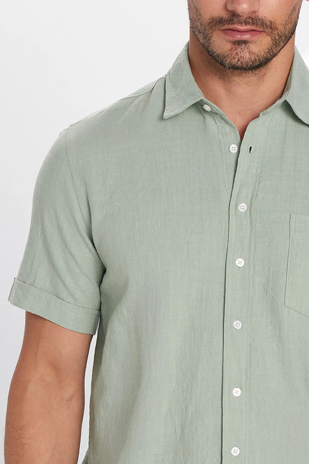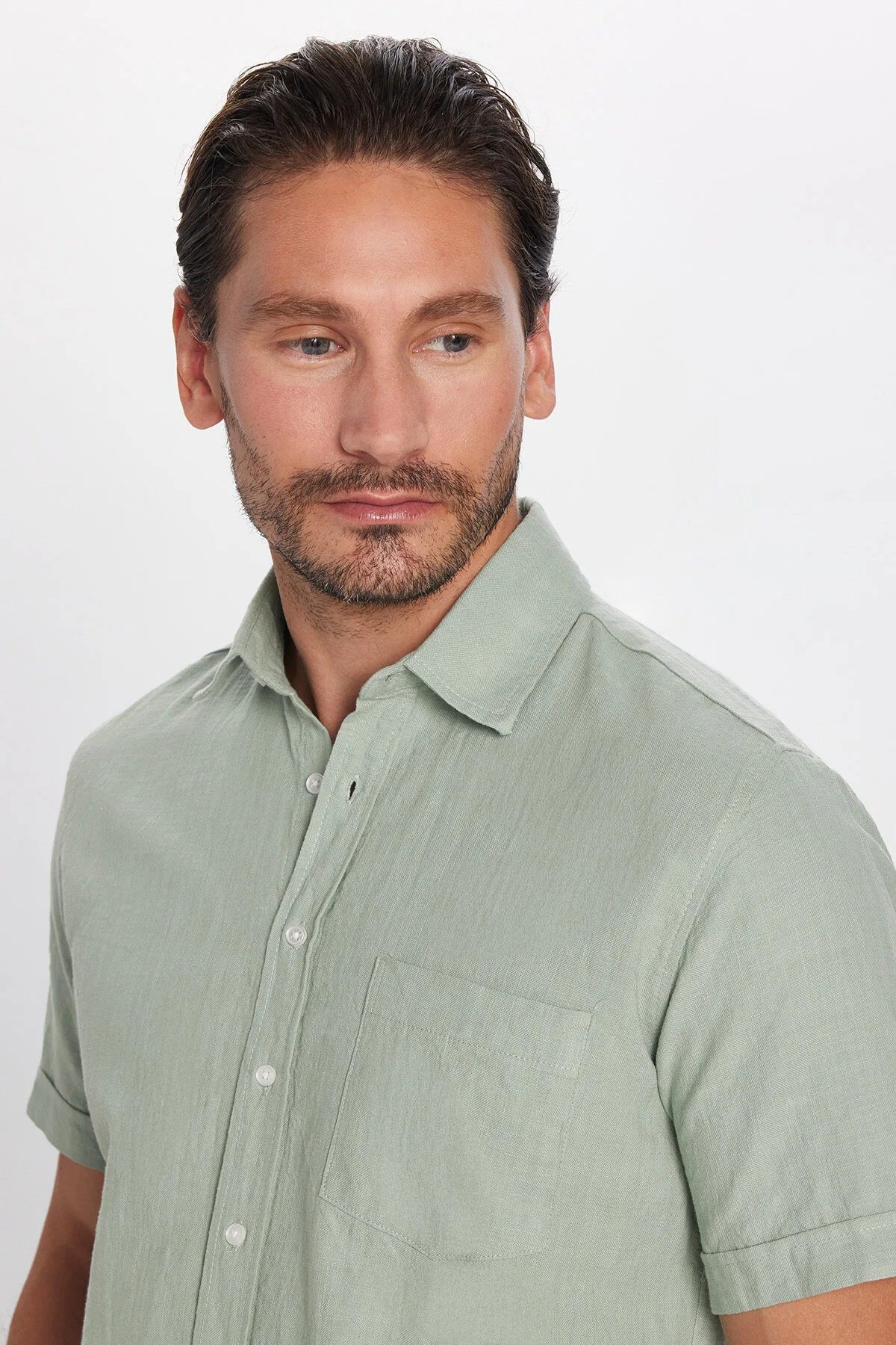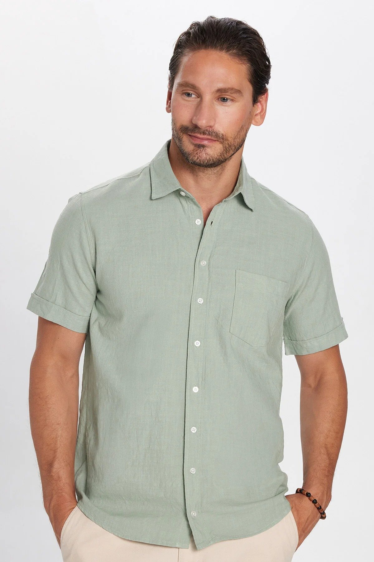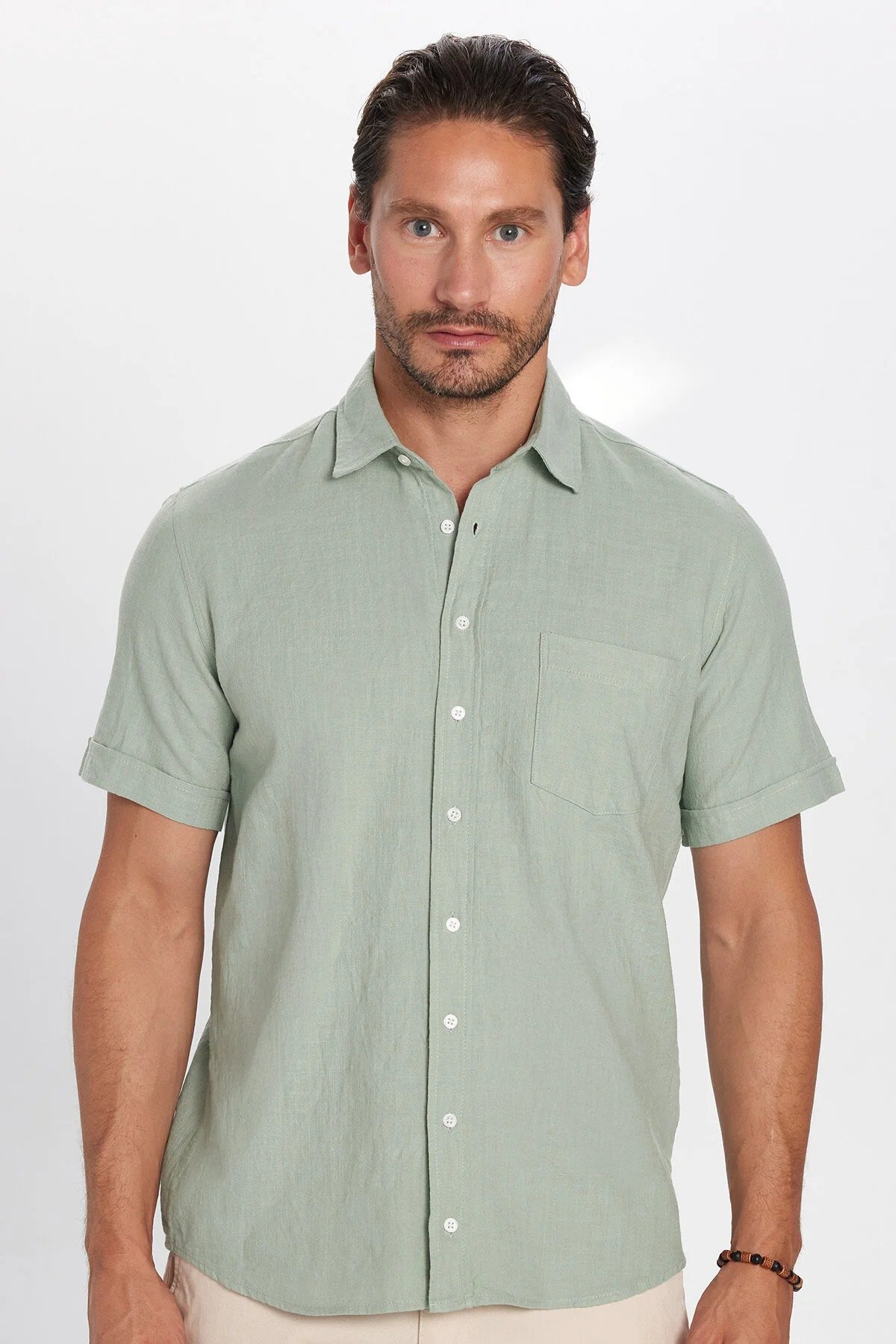 Tudors Men's Regular Fit Classic Cut Oversize 100% Cotton Linen Textured Green Shirt with Pockets